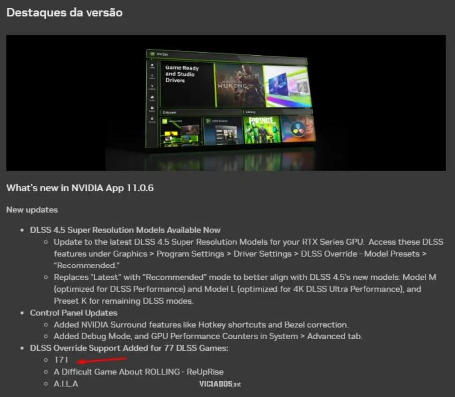 Com a chegada da atualização Nvidia App 11.0.6, o jogo brasileiro 171 passou a figurar oficialmente na lista de títulos com suporte ao DLSS Override, recurso avançado de upscaling para placas de vídeo RTX.