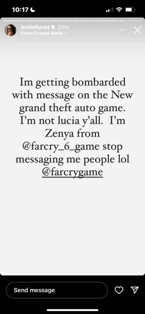Por meio de uma história publicada no Instagram, Lluvet compartilhou uma mensagem para os curiosos, afirmando estar exclusivamente envolvida com o jogo Far Cry 6 na indústria dos videogames e não com Grand Theft Auto VI.