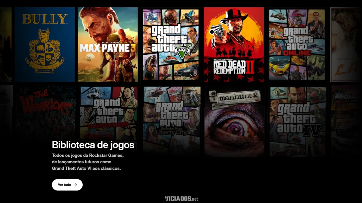 O novo layout apresenta um visual moderno, limpo e com foco total nas grandes franquias da produtora. Logo na página inicial, o grande destaque é justamente o Grand Theft Auto VI, que aparece em um enorme banner de destaque.