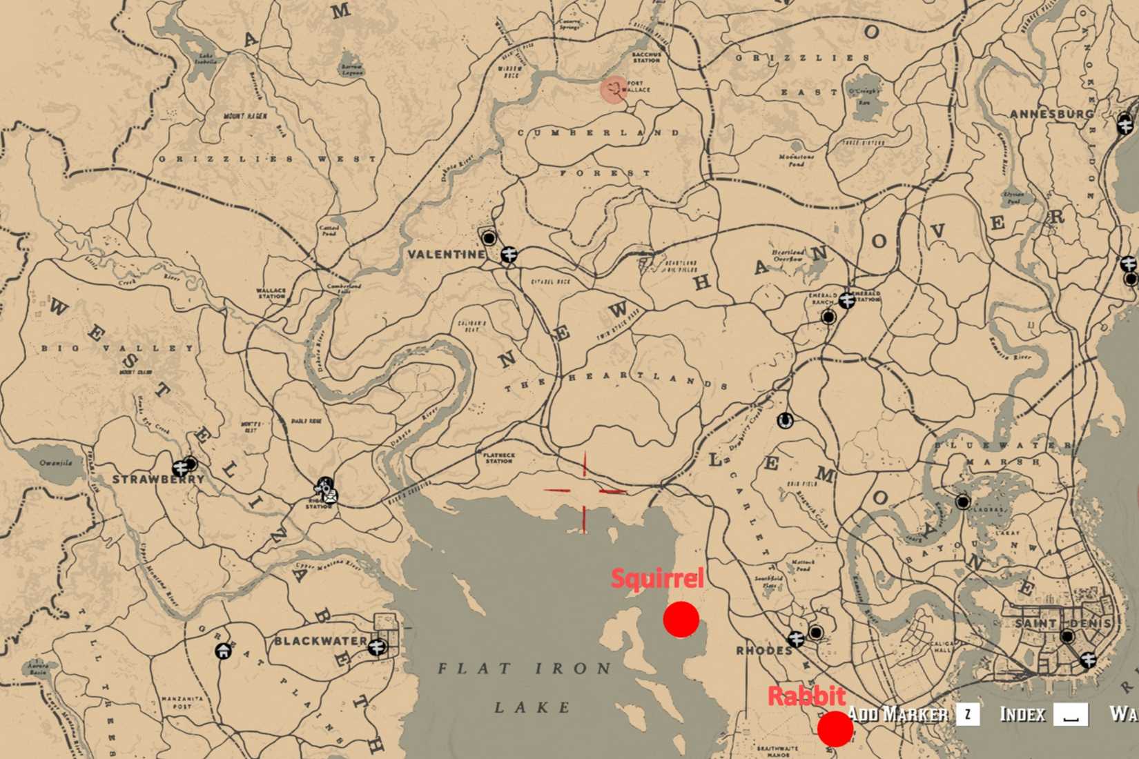 - Esquilo Perfeito: Encontrado ao redor das árvores de Clemens Point, a oeste de Rhodes em Scarlett Meadows, Lemoyne. Utilize o Arco com Flecha de Caça Pequena.