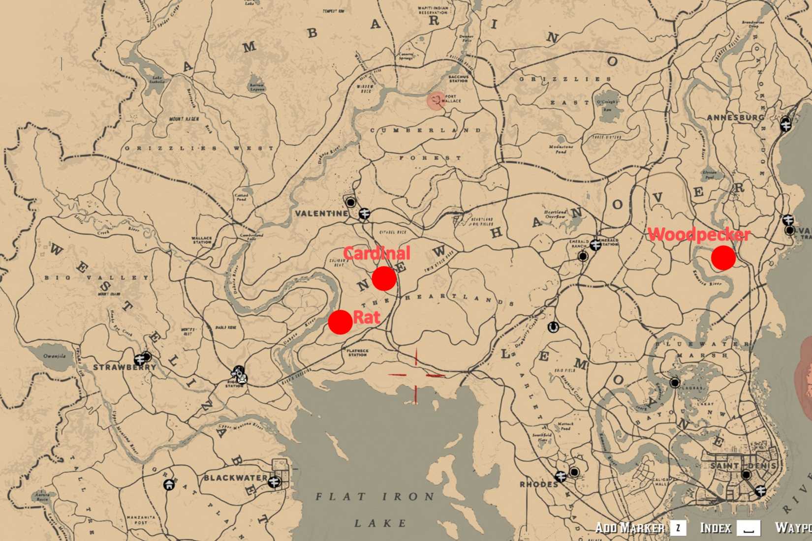 - Pica-pau Perfeito: Avistados frequentemente voando ao redor de Fort Brennand, ao norte do Rio Kamassa perto de Van Horn Trading Post. Use Arco com Flecha de Caça Pequena.