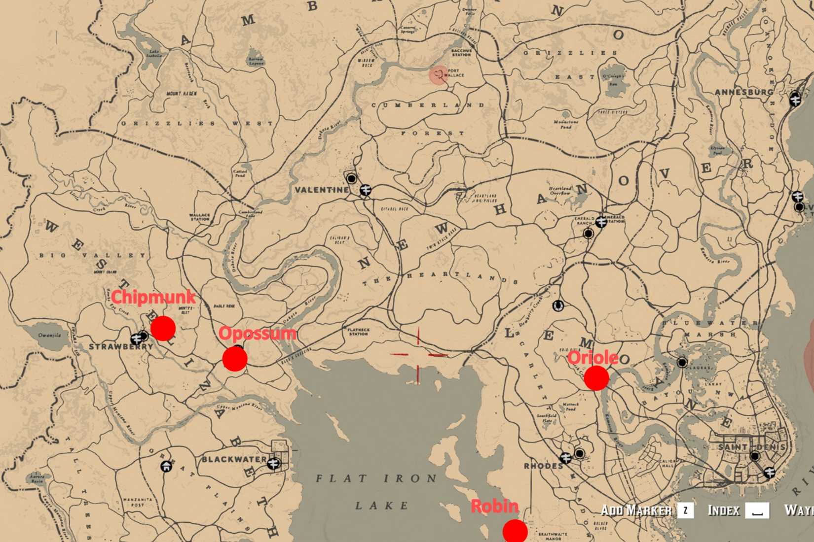 - Oriole Perfeito: Aparecimento quase garantido no corrimão da pequena ponte entre Ringneck Creek e Rio Kamassa, sob o ‘M’ e ‘O’ de ‘Lemoyne’. Use Arco com Flecha de Caça Pequena.