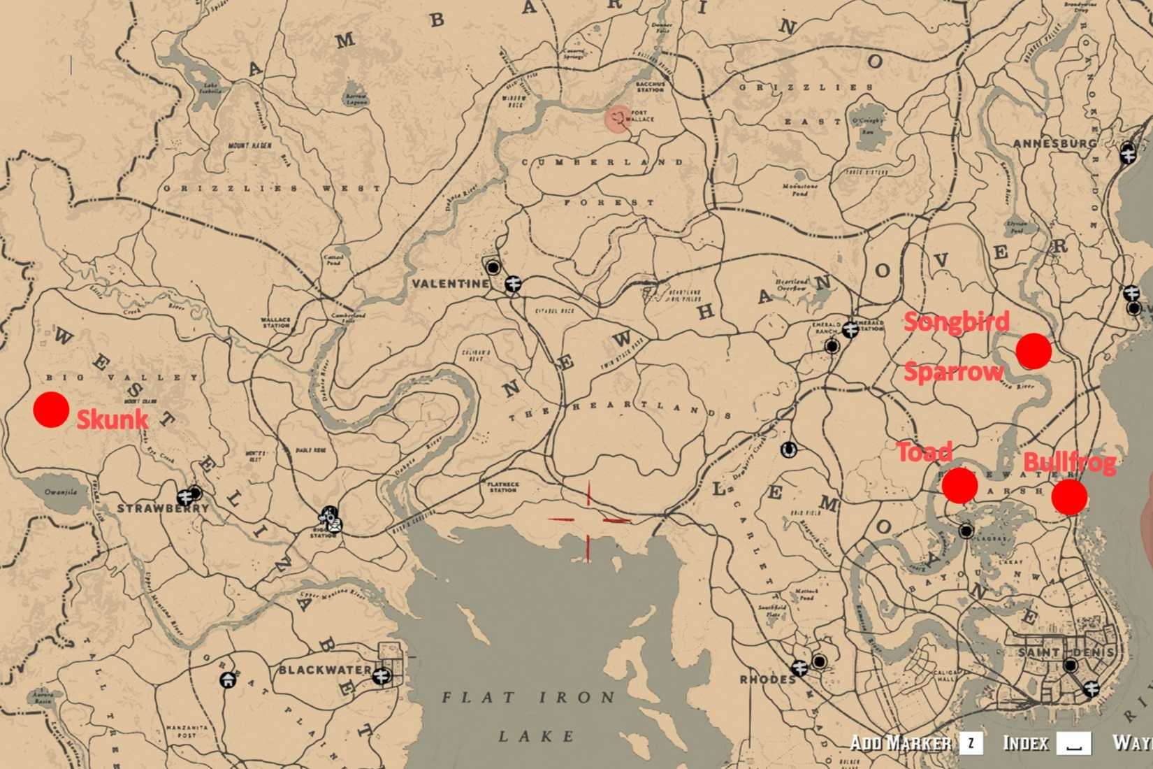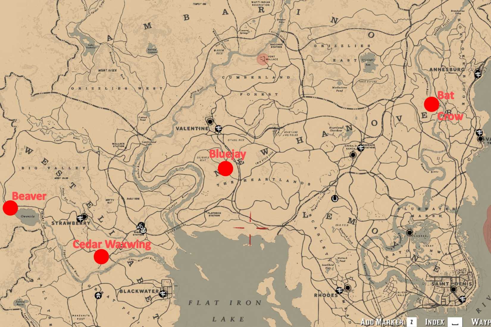 - Castor Perfeito: Habita a costa noroeste do Lago Owanjila, a oeste de Strawberry. Use Rifle Varmint e lembre-se: não esfole o castor!