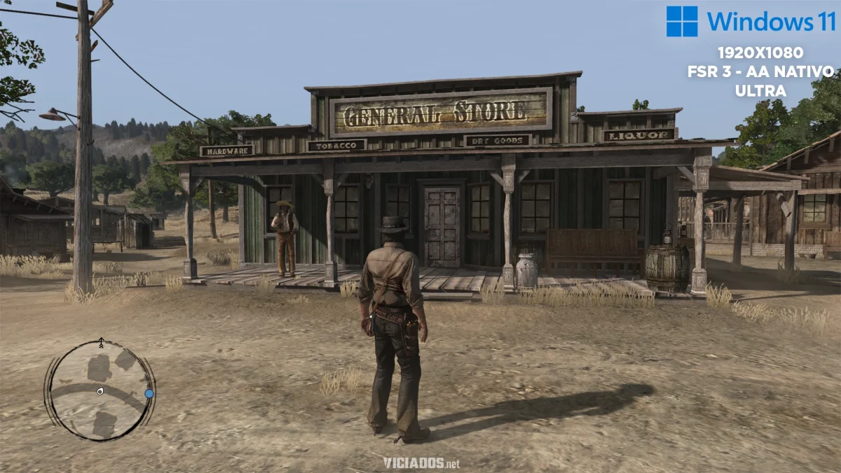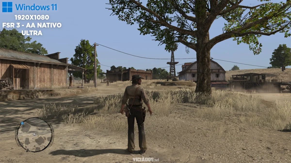 Aqui temos um fenômeno curioso. Red Dead Redemption no PC roda com Anti-Aliasing (AA) nativo em 1080p com o FSR3, ou com o FXAA, mas isso gera um efeito colateral na vegetação antiga do Red Dead Redemption. A nitidez excessiva do PC (mesmo que ajustada) expõe a idade da engine, deixando as bordas das folhas e árvores com um aspecto “crocante” e serrilhado contra o céu.