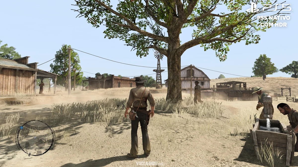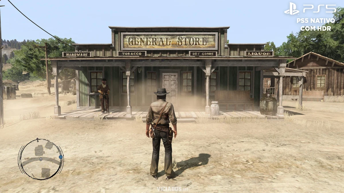 As imagens de Red Dead Redemption no PS5 foram capturadas com HDR ativado, e a diferença de tom é gritante. O console da Sony aposta em uma iluminação global muito forte, simulando um sol intenso de deserto que “lava” um pouco as cores escuras, mas traz um céu vibrante e natural.